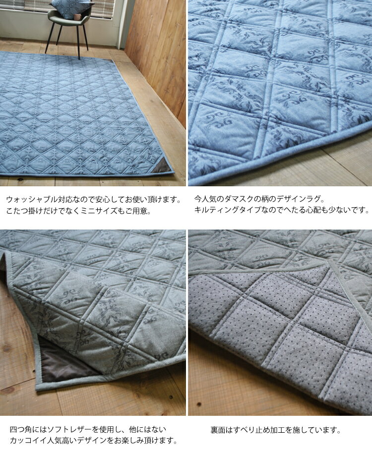 商品名 クエルノ キルトラグ ホットカーペットカバー対応 組成 表側地:綿100% 付属:合成皮革 裏側地:ポリエステル100% 中綿:ポリエステル100% ウレタンフォーム ※ウオッシャブル対応 裏 不織布貼、すべり止め付 原産国 中国 備考 ※輸入品の為サイズに多少の誤差があります。